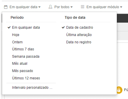Nosso filtro por data foi turbinado e agora você pode escolher de qual data estamos falando: “Data de cadastro” ou “Última alteração” de um registro ou até pelo campo “Data” que está no registro.
