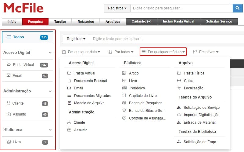 Logo na página de pesquisa você pode filtrar sua busca dentre os diferentes módulos do McFile direto pela barra lateral ou também usando o botão de filtragem por módulo logo abaixo da caixa de busca.