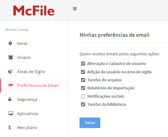 Você sabia que é possível configurar quais e-mails recebe do McFile? Indo das notificações sociais às áreas de sigilo, você pode ter total conhecimento sobre tudo que acontece em seu ambiente. Vamos entender como funciona?